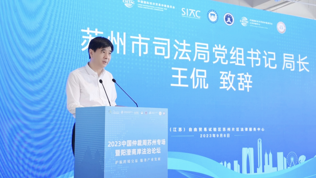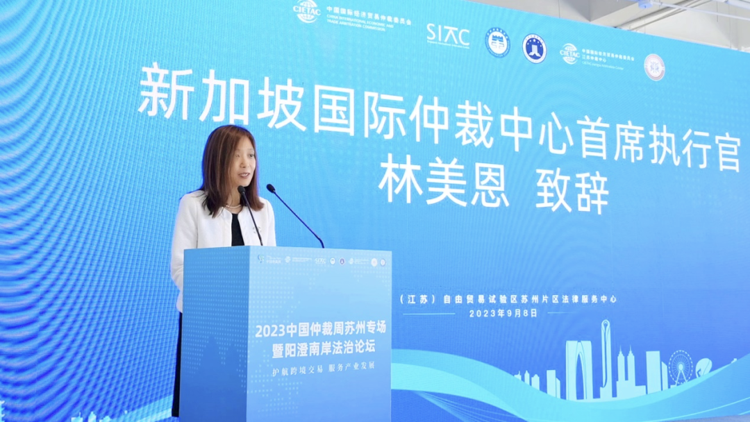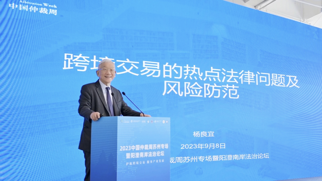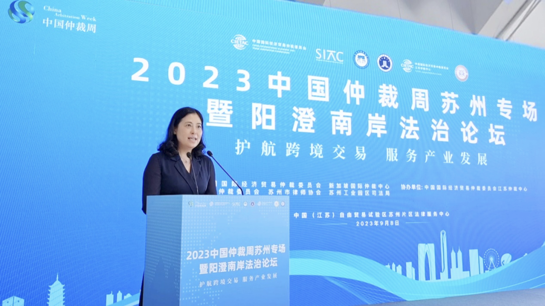 9月8日,2023中国仲裁周苏州专场暨阳澄南岸法治论坛在苏州成功举办。本次论坛由中国国际经济贸易仲裁委员会(CIETAC,简称“贸仲”)联合新加坡国际仲裁中心(SIAC,简称“新仲”)、苏州仲裁委员会、苏州市律师协会和苏州工业园区司法局共同主办,中国国际经济贸易仲裁委员会江苏仲裁中心(简称“贸仲江苏中心”)协办。中国国际经济贸易仲裁委员会仲裁院副院长、贸仲江苏中心秘书长谷岩,新仲首席执行官林美恩,苏州市司法局党组书记、局长王侃,苏州工业园区党工委委员、管委会副主任、政法委书记姚文蕾出席本次论坛。论坛特邀贸仲资深仲裁员、最高人民法院国际商事法庭专家委员会委员、亚太区域仲裁组织(APRAG)原主席、上海国际仲裁学院主席杨良宜先生发表主旨演讲。开幕式由苏州工业园区司法局副局长吴硕希主持。