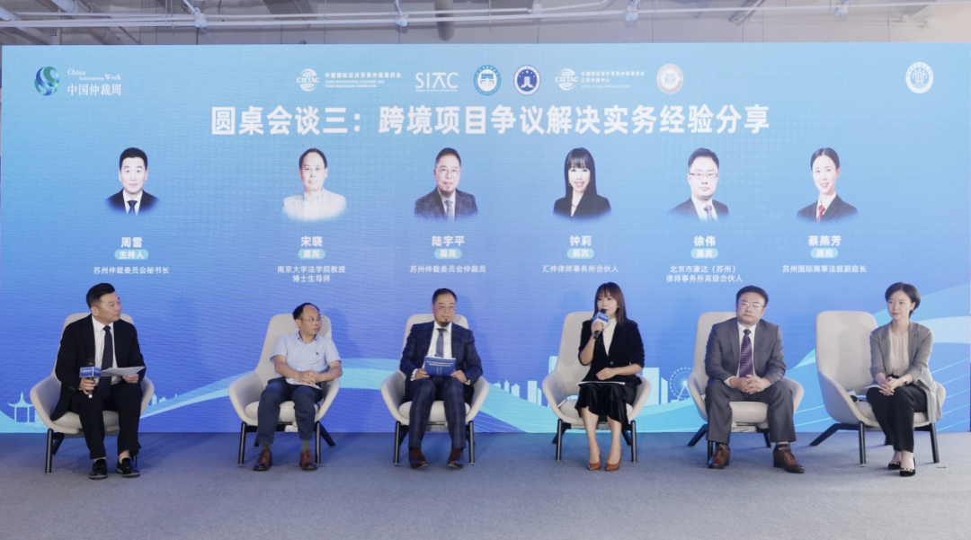 第三个议题“跨境项目争议解决实务经验分享”由苏州仲裁委员会秘书长周雷主持。贸仲仲裁员、南京大学法学院教授、博士生导师宋晓,苏州仲裁委员会仲裁员陆宇平,汇仲律师事务所合伙人钟莉,北京市康达(苏州)律师事务所高级合伙人徐伟,苏州国际商事法庭副庭长蔡燕芳分别发言。各位嘉宾围绕如何充分发挥仲裁争议解决方式的作用,跨境项目合同在磋商、订立与履行过程中就争议解决需要注意的问题,实务中如何更好地适应国际商事仲裁与国内仲裁程序的差异以及第三方资助给国际商事仲裁实践带来的法律问题进行了热烈的讨论。