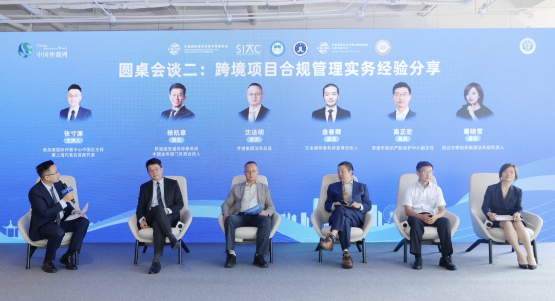 第二个议题“跨境项目合规管理实务经验分享”,由新仲中国区主任兼上海代表处首席代表张寸渊主持。新加坡安盛律师事务所中国业务部门负责合伙人杨凯章,亨通集团法务总监沈法明,贸仲仲裁员、方本律师事务所首席合伙人金春卿,苏州市知识产权保护中心副主任高正宏,信达生物制药集团法务部负责人屠晓雪分别发言。各位嘉宾结合自身实务经验围绕跨境并购和境外投资过程常见的合规问题,企业海外业务知识产权合规管理,以及合规对企业商务合同缔结和履行的影响,分享了各自精彩的观点和见解。