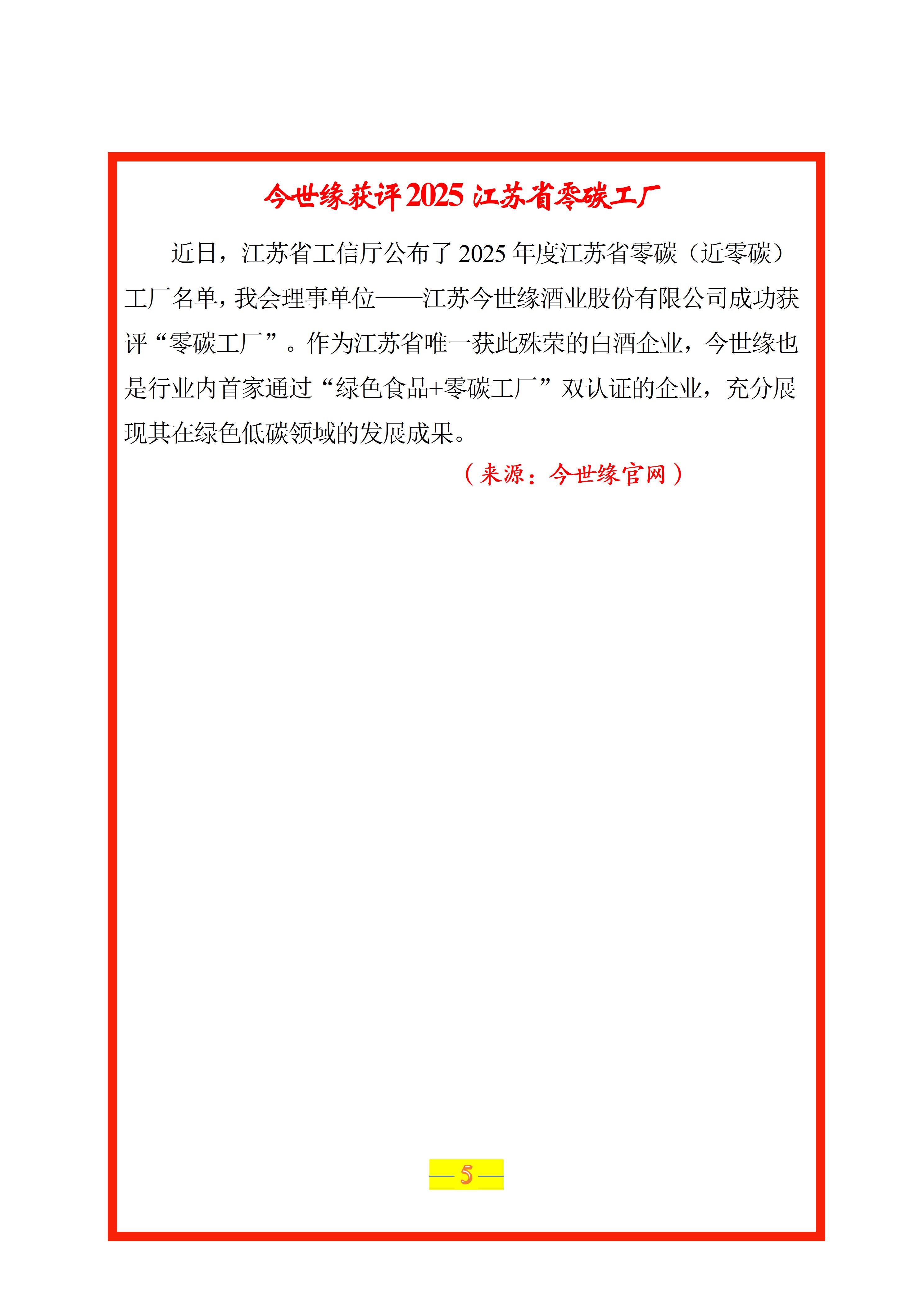 今世缘获评2025江苏省零碳工厂