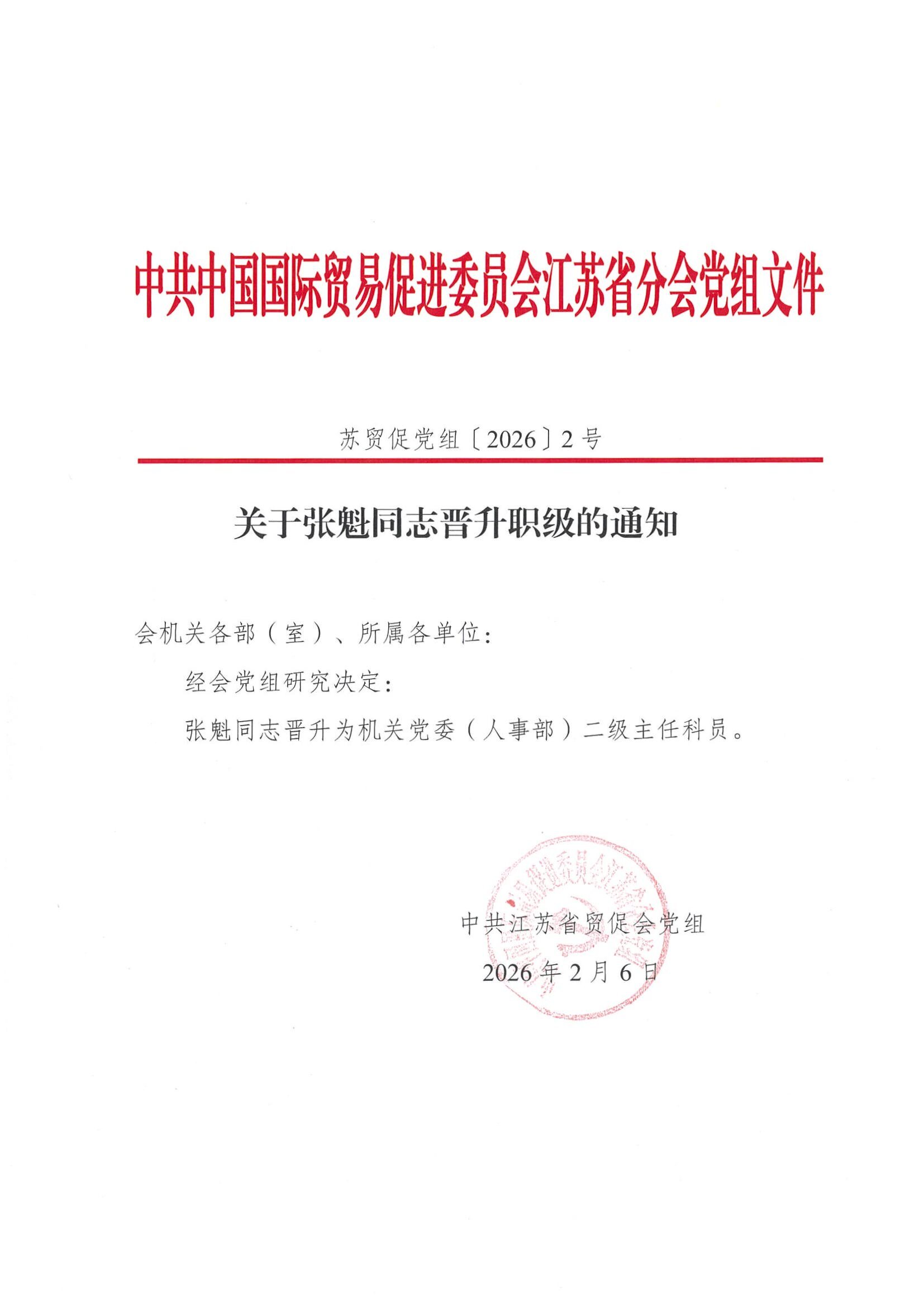 关于张魁同志晋升职级的通知