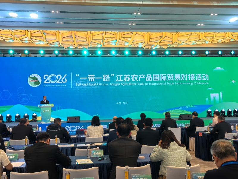 4月24日下午,由省农业农村厅、省贸促会和江苏南京国家农业高新技术产业示范区共同主办的2026“一带一路”江苏农产品国际贸易对接活动在苏州国际博览中心举行。省农业农村厅副厅长曹丽虹、苏州市人民政府副市长查颖冬、乌拉圭东岸共和国驻上海总领事馆总领事马塞罗·马龙出席活动并致辞,省贸促会副会长魏杰钢主持活动。来自秘鲁、马来西亚、荷兰、韩国等国驻上海总领事馆官员,境内外贸易投资促进机构及我省龙头农业企业、供销社、电商平台、代理商和进口商代表100余人参加活动。